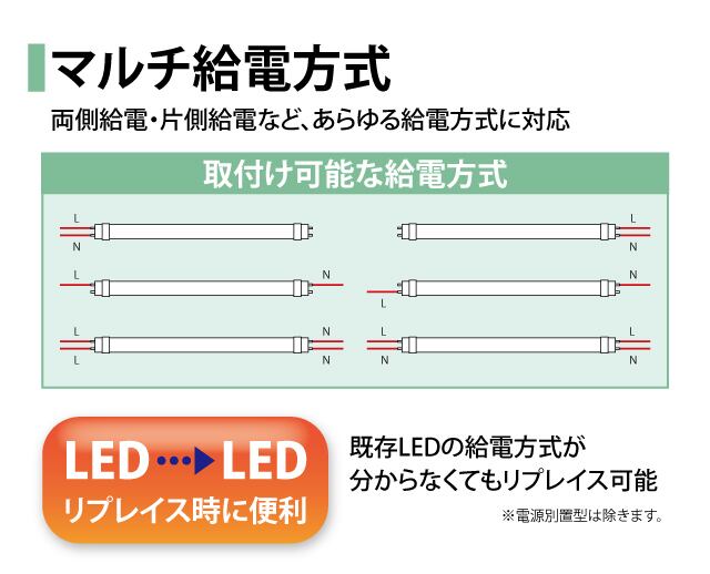LEDからLEDに交換する場合は、既存の給電方式が分からなくても交換可能です。